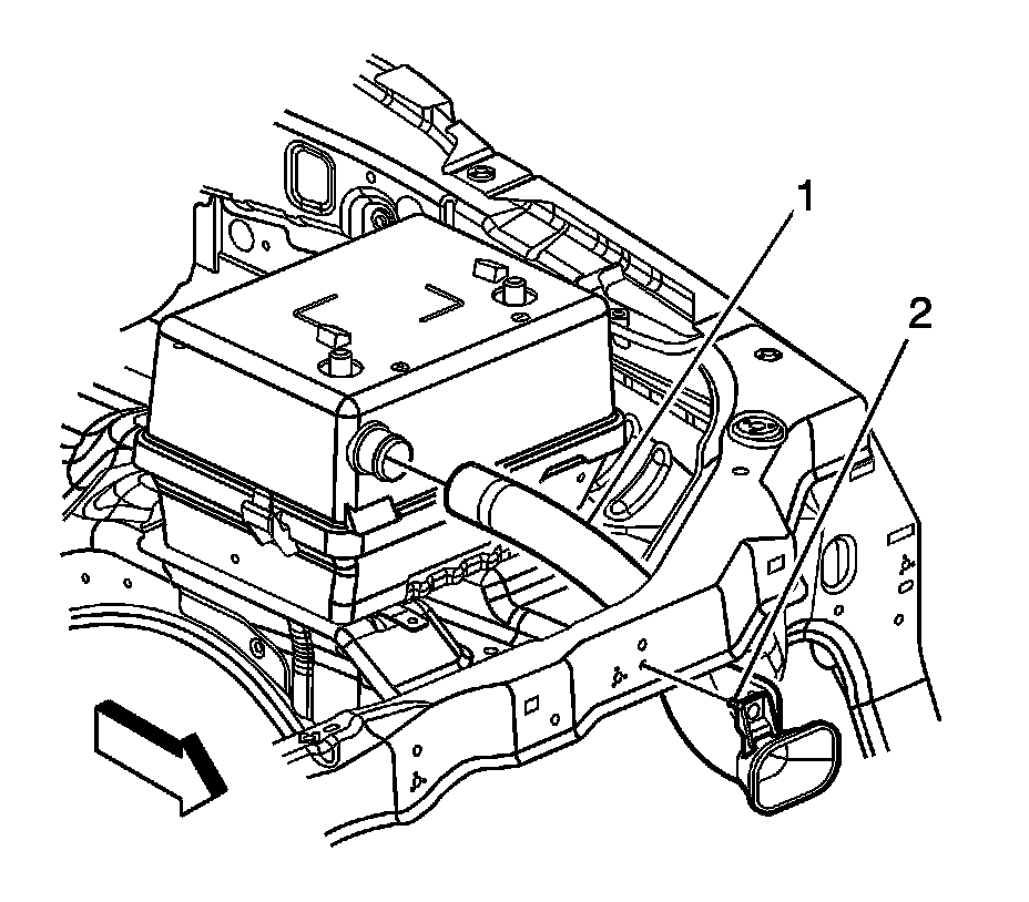 9. Install the engine wiring harness clip (2) to the upper battery box.