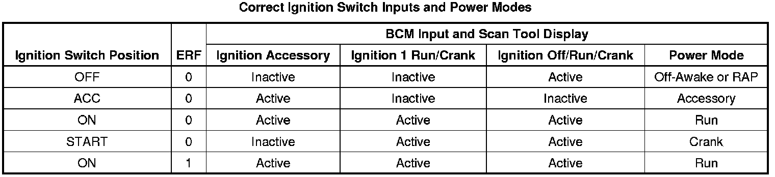 Those modules that have discrete ignition signal inputs also remain in the state dictated by the last valid BCM message received on the serial data circuits. They then check the state of their discrete ignition input to determine the current valid state. If the discrete ignition input is active, B+, the modules will fail-safe to the RUN power mode. If the discrete ignition input is not active, open or 0 voltage, the modules will fail-safe to OFF-AWAKE. In this state the modules are constantly checking for a change status message on the serial data circuits and can respond to both local inputs and serial data inputs from other modules on the vehicle.