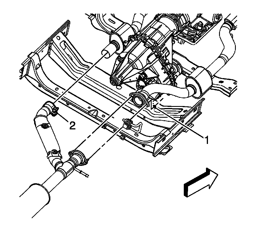 4. Loosen the muffler to catalytic converter clamp (2).