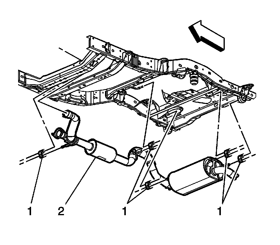 5. With the aid of an assistant, separate the muffler hangers from the insulators (1).