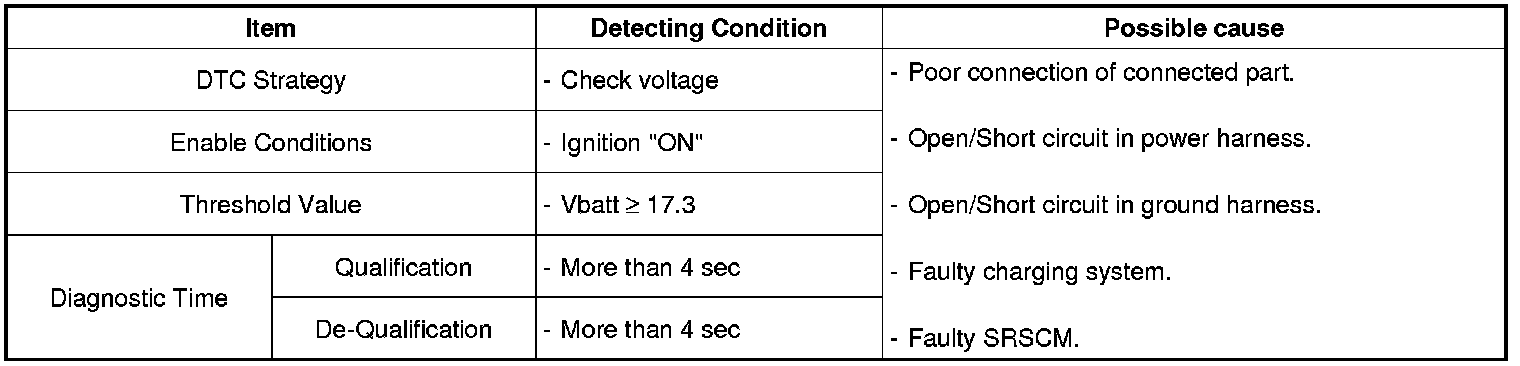 The SRSCM sets DTC B1101 and turns warning light on if voltage above threshold value is detected for more than 4 sec.