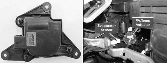 Temperature control actuator located at heater unit. It contains temp motor that changes temp door position and potentiometer that monitors position of temp door. Temperature control actuator regulates the temperature by the procedure as follows. Signal from control unit adjusts position of temp door by operating temp motor and then temperature will be regulated by the hot/cold air ratio decided by position of temp door. In operation, potentiometer delivers temp door position transformed into voltage value to A/C ECU.