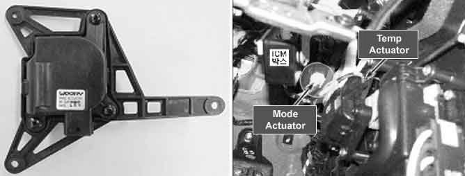 The mode control actuator mounted on heater unit adjusts position of mode door by operating Direction Motor based on signal of A/C control unit. Pressing mode select switch makes the mode control actuator shift in order of vent-> B/L -> floor -> mix.