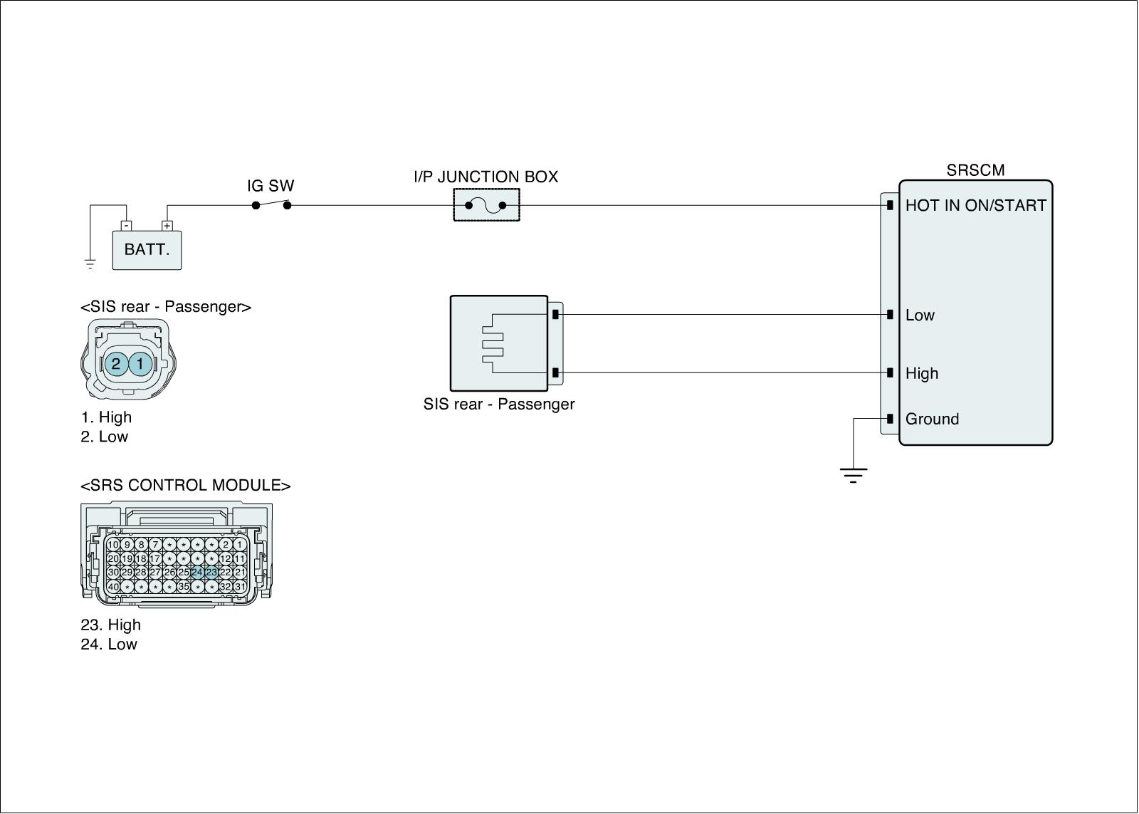 The SCM detects the impact signals of the Pressure-Side Impact Sensor and Rear Side Impact Sensor and compares with signals of the safe sensor inside. If the signals of all sensors are judged as a collision, the side-airbag and the curtain-airbag would be unfolded.