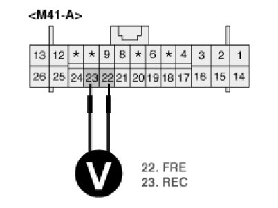 3. Measure voltage between terminal "22" and "23" of A/C Control Unit while operating the Intake switch.