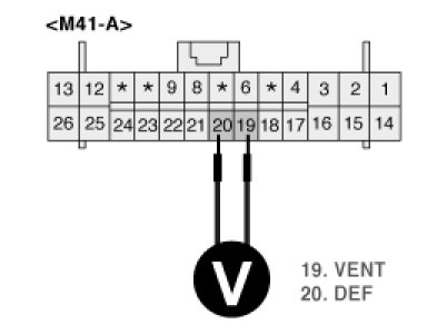 3. Measure voltage between terminal "19" and "20" of A/C Control Unit while operating the temp switch.
