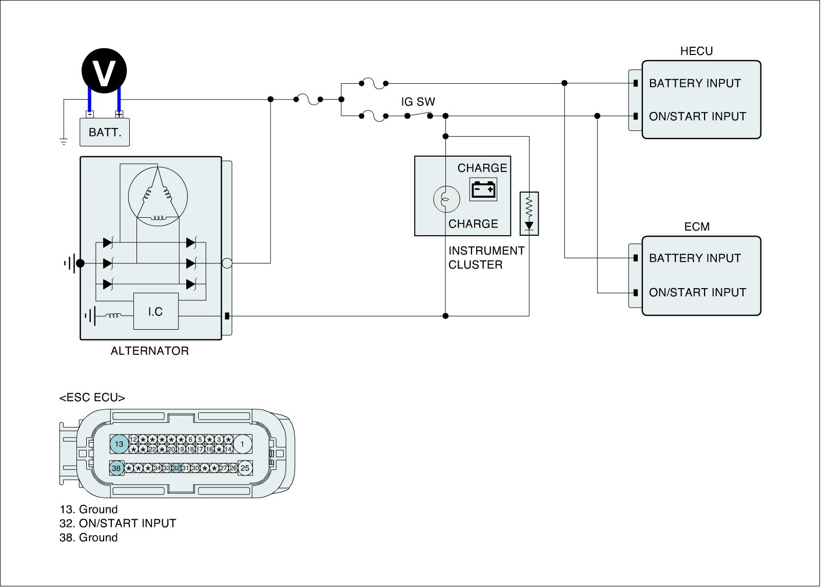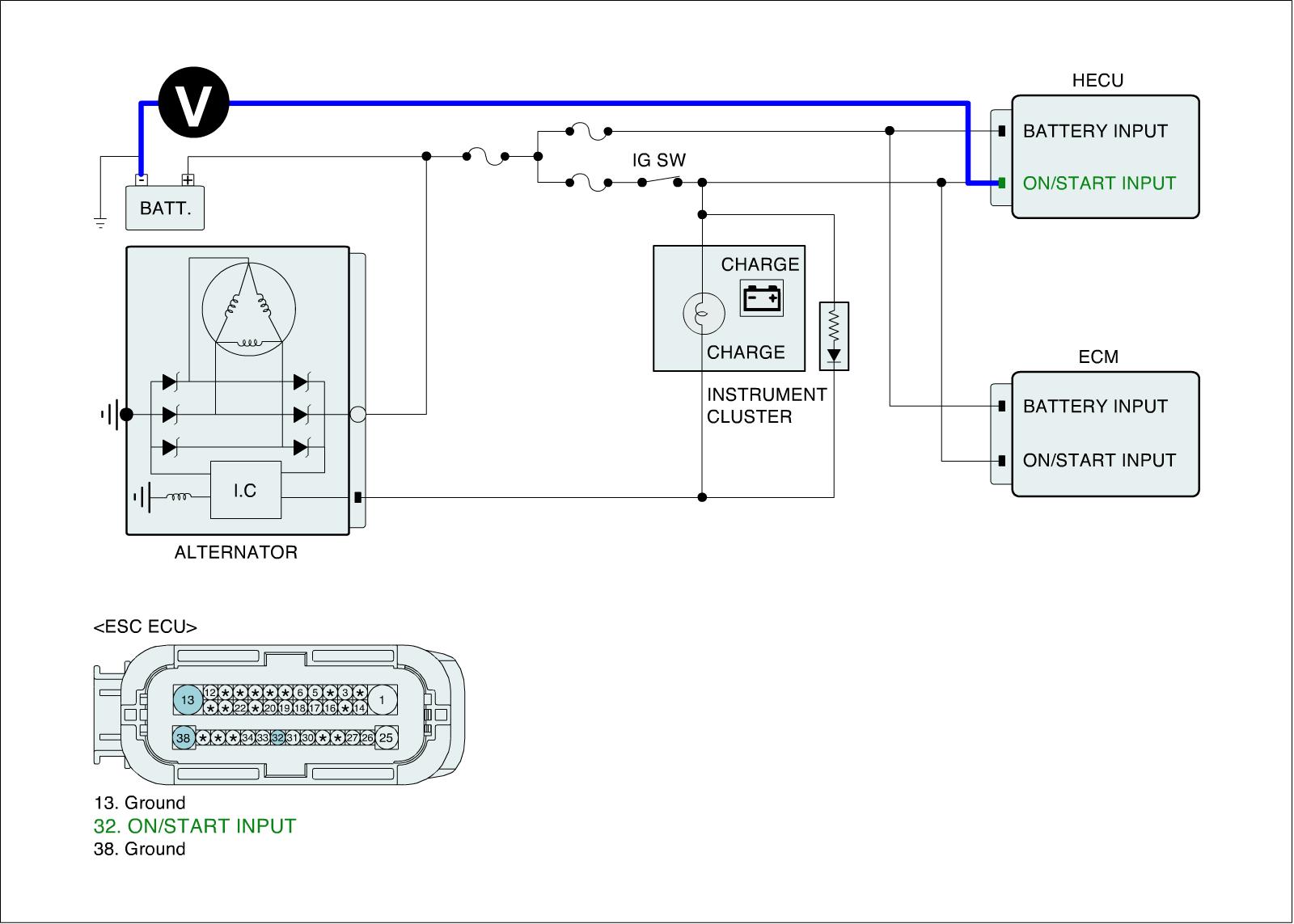 2. Measure voltage between the battery terminal (+) and power terminal of the HECU harness connector.
