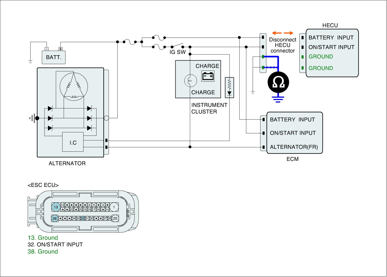 3. Measure resistance between ground terminal of the HECU harness connector and chassis ground.
