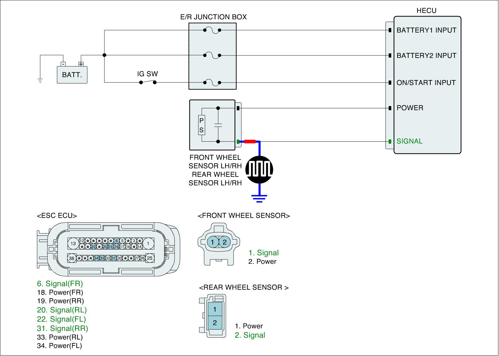 4. Measure waveform between signal terminal of the wheel speed sensor harness connector and chassis ground with oscilloscope.