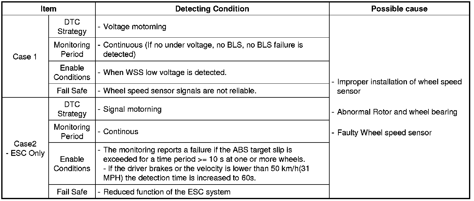 If power supply of the WSS input amplifier is not normal or the ABS control cycle is continued abnormally, if the exact fault location among 4 WSS can not be determined, This code is set.