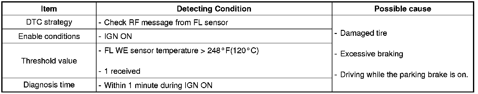This DTC indicates that the Front Left WE sensor has seen a temperature in excess of 248 °F (120 °C). This warning is to notify the driver that there is a problem that may affect sensor performance.