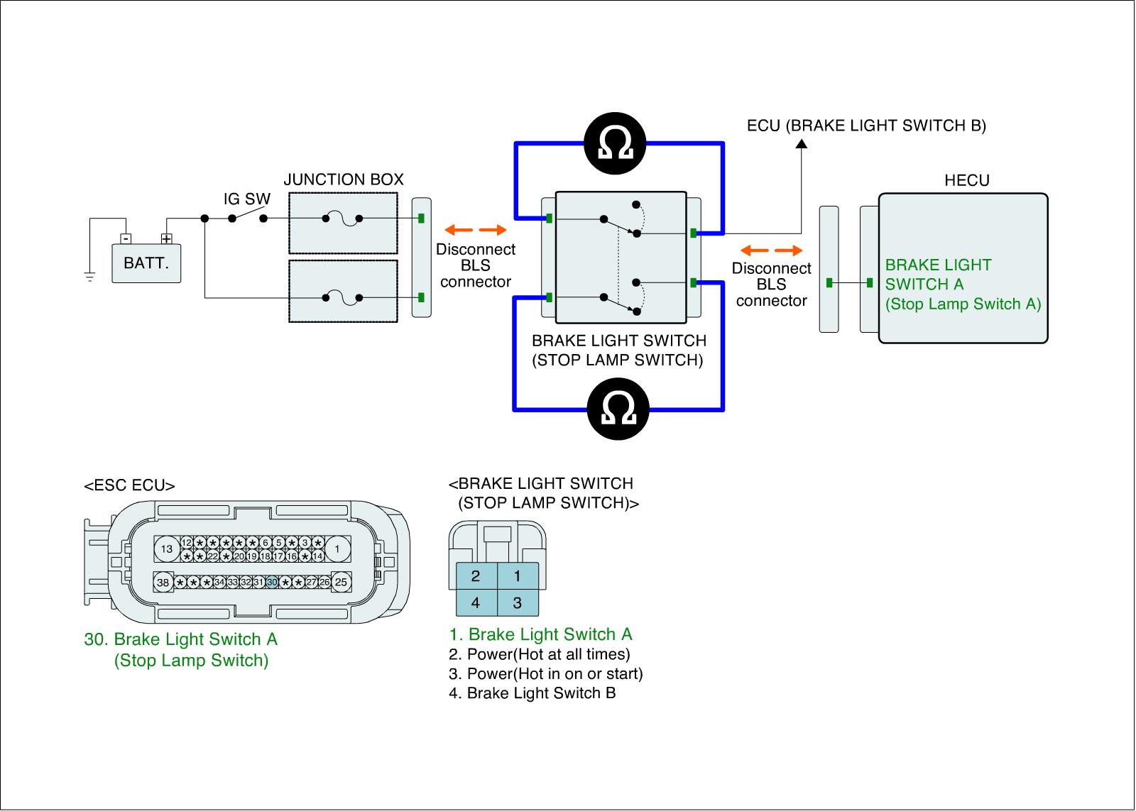 3. Measure resistance between power terminal and signal terminal of the brake light switch A, B connector.