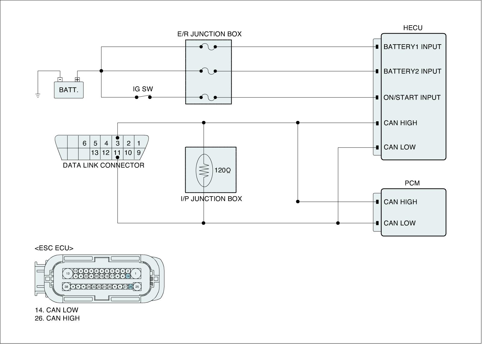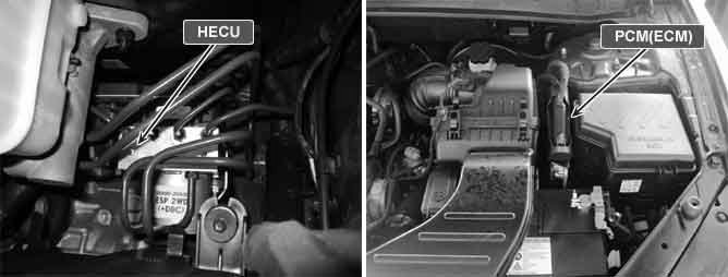 The HECU send requirement data, such as Torque reduction, the number of fuel cut cylinders, and ESC control requests, to the Engine PCM (ECM & TCM) through CAN bus line.