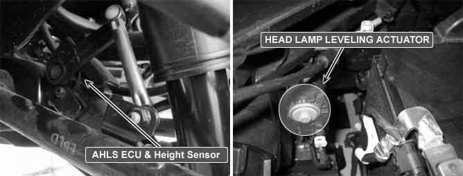 AHLS provides driver with the best visibility by adjusting vertical direction of the headlamp. It consists of ECM, Linkage and actuator. The SIECM which is mounted in rear wheel suspension detects the change of vehicle vertical location and control actuator (which changes the vertical direction of the headlamp) based on the driving and load condition. The EEPROM is equipped with a temperature sensor which is used to avoid damage related to overtemperature.