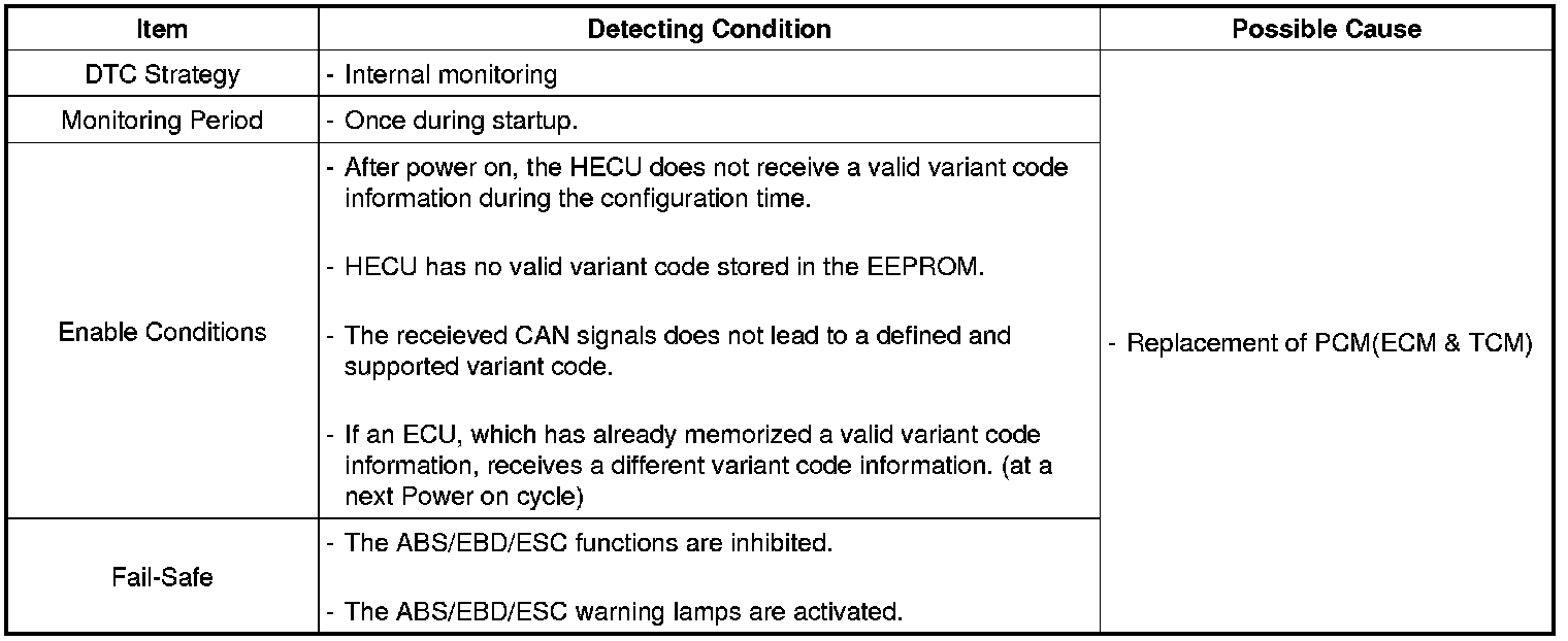 The HECU checks the variant code after ignition. If a inappropriate variant code is detected or there is no variant code, a fault is detected.