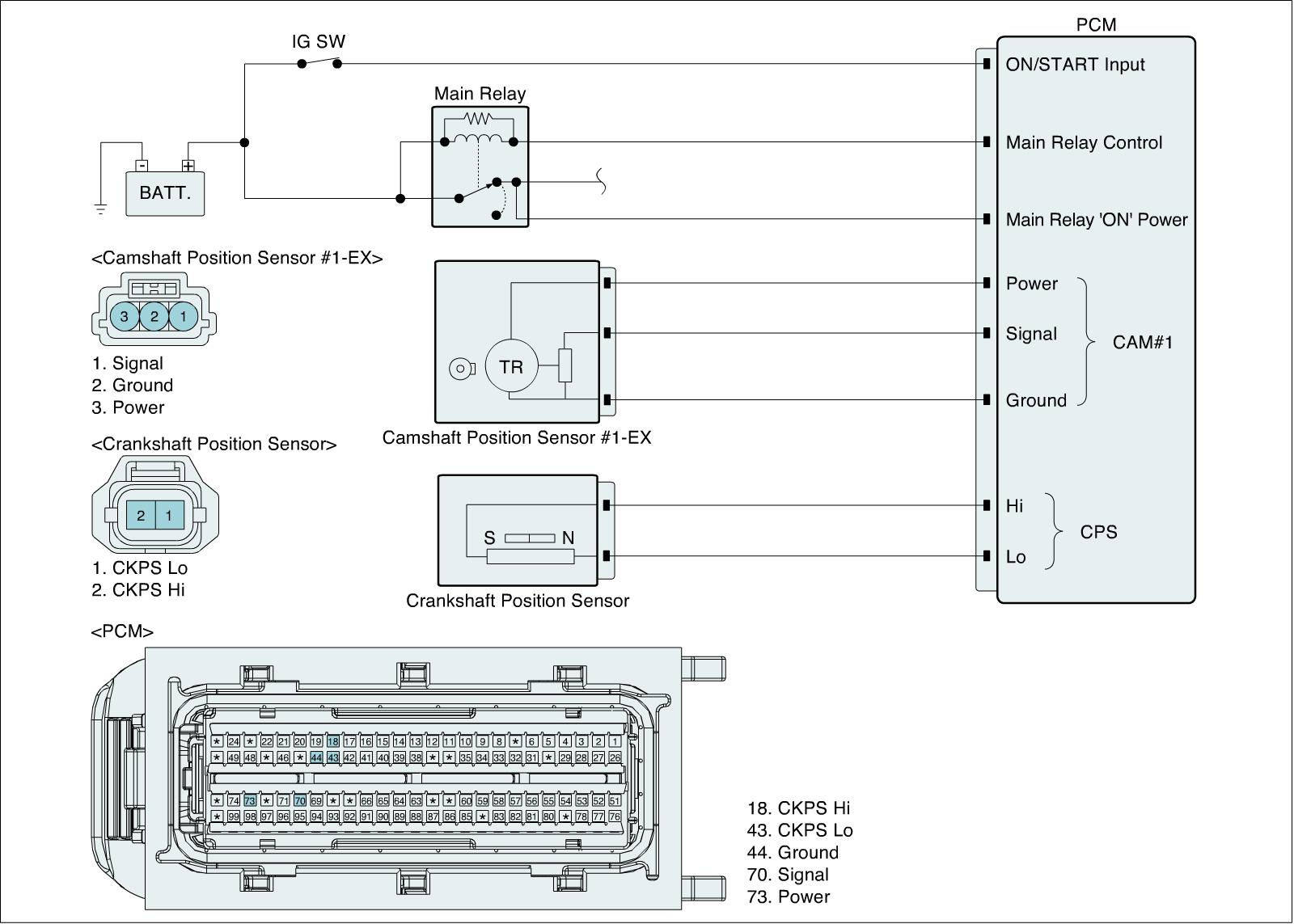 This example shows a typical Crankshaft Position Sensor (CKPS) and Camshaft Position Sensor (CMPS) waveform at idle. If the 17th signal of the CKPS after missing tooth is aligned with the high signal of the CMPS at idle, ECM recognizes that Synchronization between CKPS and CMPS is completed.