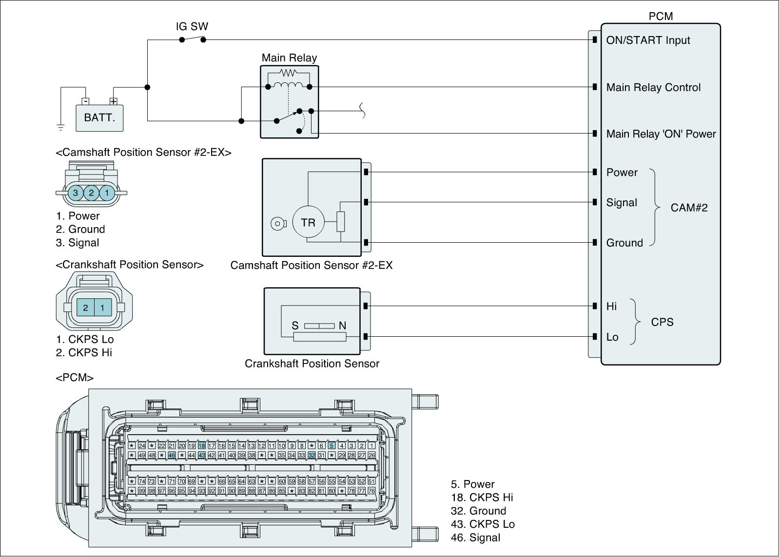 This example shows a typical Crankshaft Position Sensor (CKPS) and Camshaft Position Sensor (CMPS) waveform at idle. If the 17th signal of the CKPS after missing tooth is aligned with the high signal of the CMPS at idle, ECM recognizes that Synchronization between CKPS and CMPS is completed.