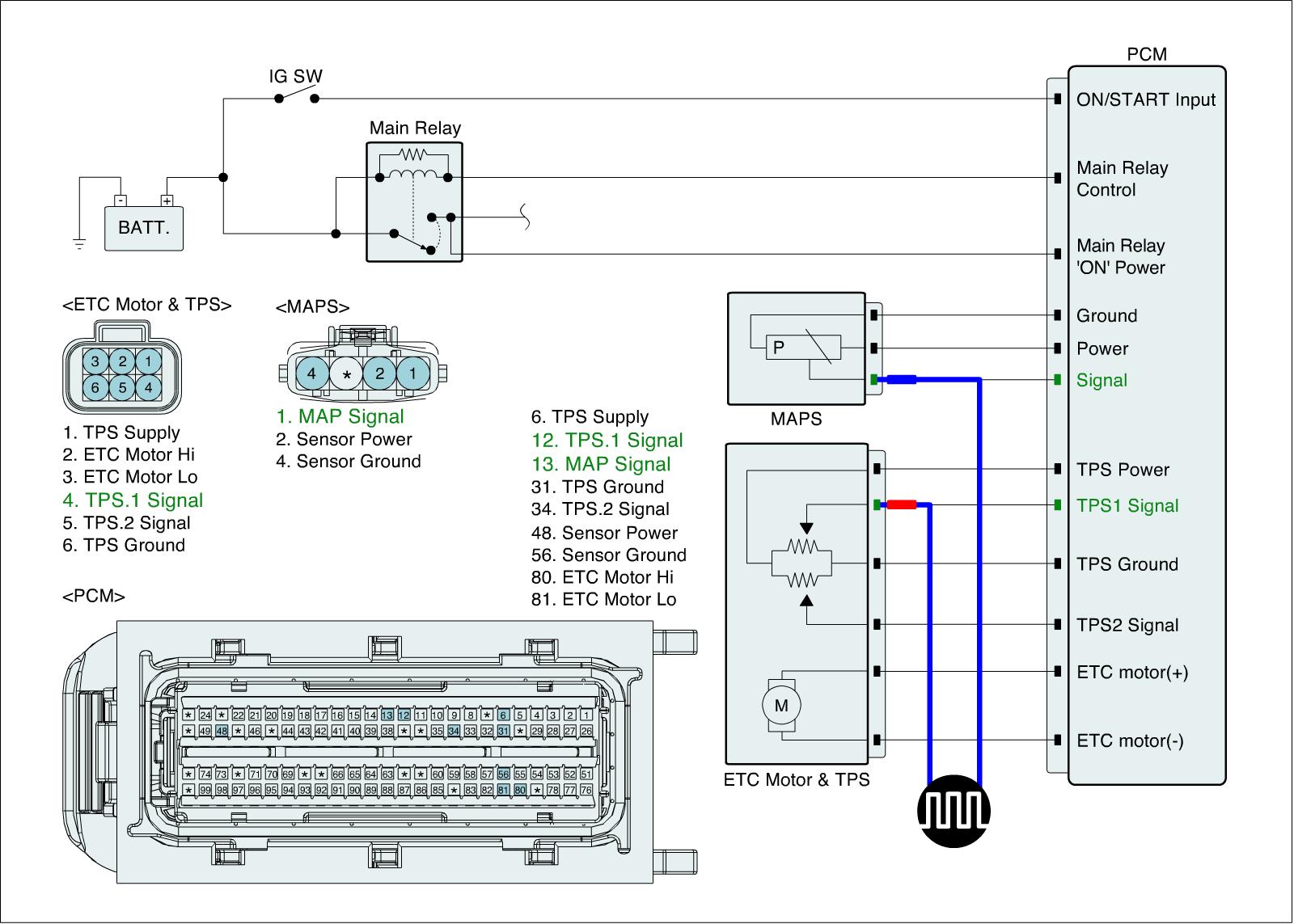 2. Connect probe to MAPS and TPS to check signal waveform by using oscilloscope function.