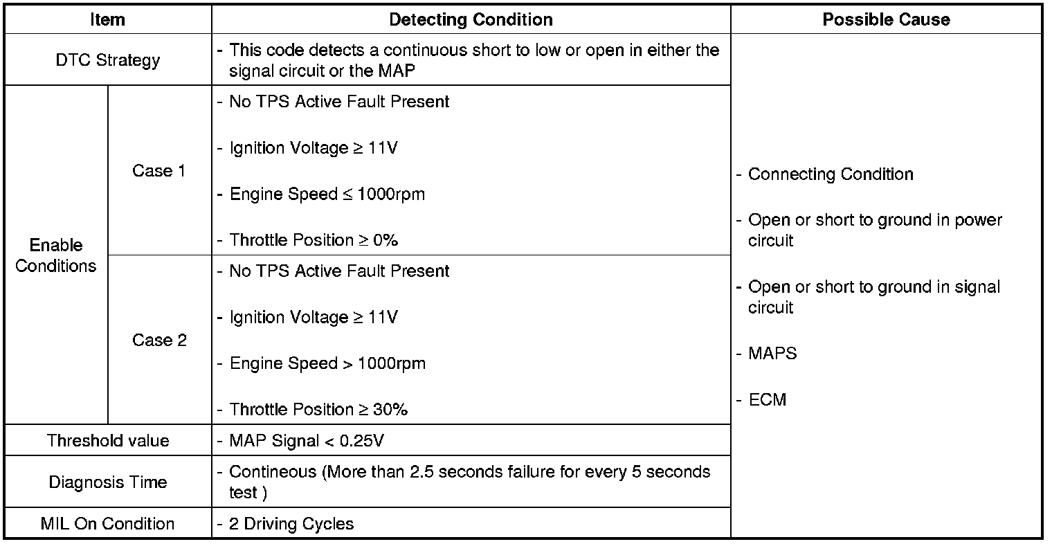 Checking output signals of MAPS every 5 sec. under detecting condition, if an output signal is below 0.25 V for more than 2.5 sec, ECM sets P0107.
