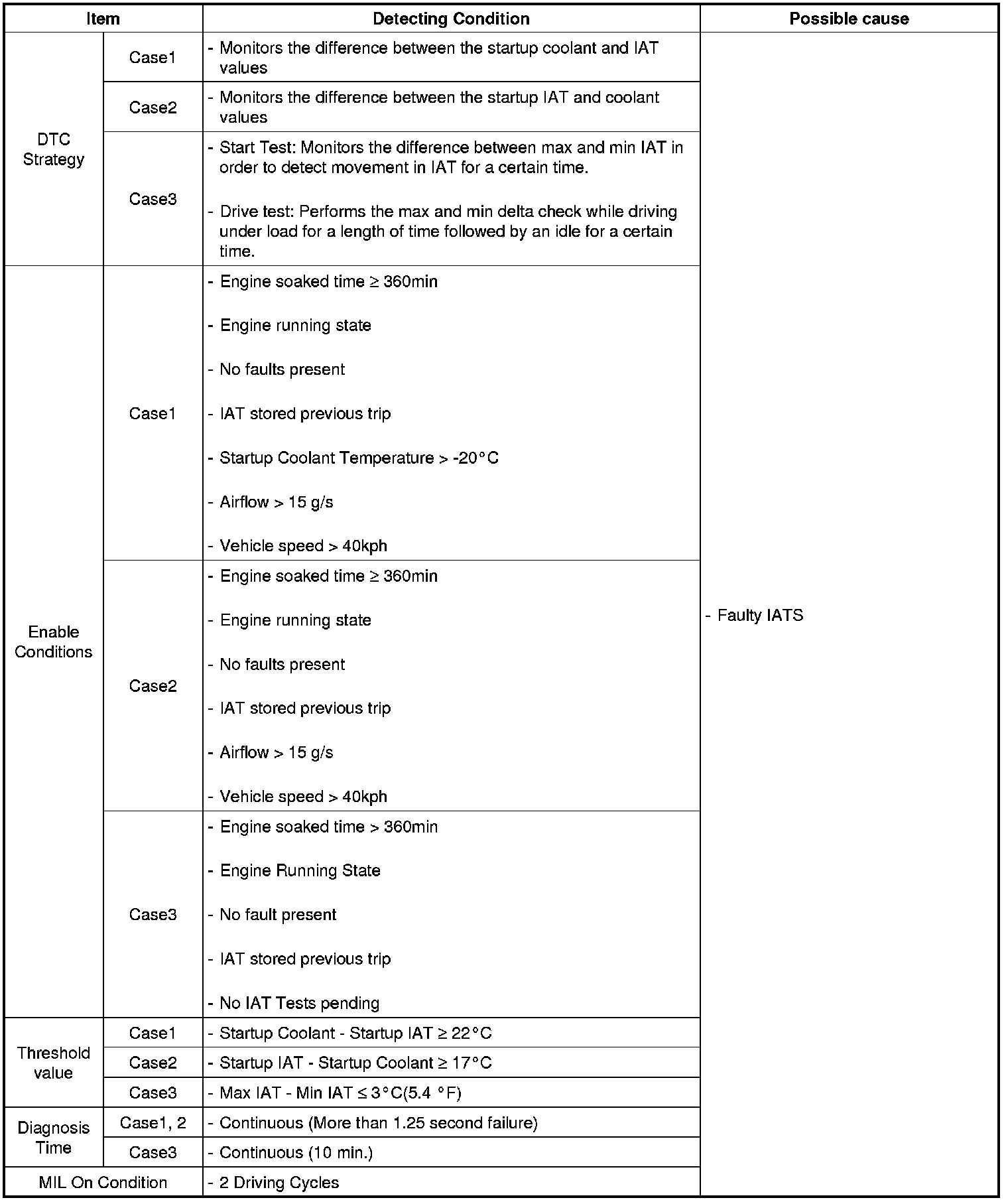 ECM monitors temperature difference between MAX. and MIN IATS in order to detect movement in IATS not only Start Test but Drive Test while enable condition is met. If ECM detects intake air temperature changes less than 5.4 °F. ECM determines that a fault exists and a DTC is stored. ECM monitors temperature changes resulting from soaking the vehicle. Therefore, Coolant temperature and Intake temperature should be changed. If ECM detects intake air temperature correlated to coolant temperature does not change ECM determines that a fault exists and a DTC is stored.