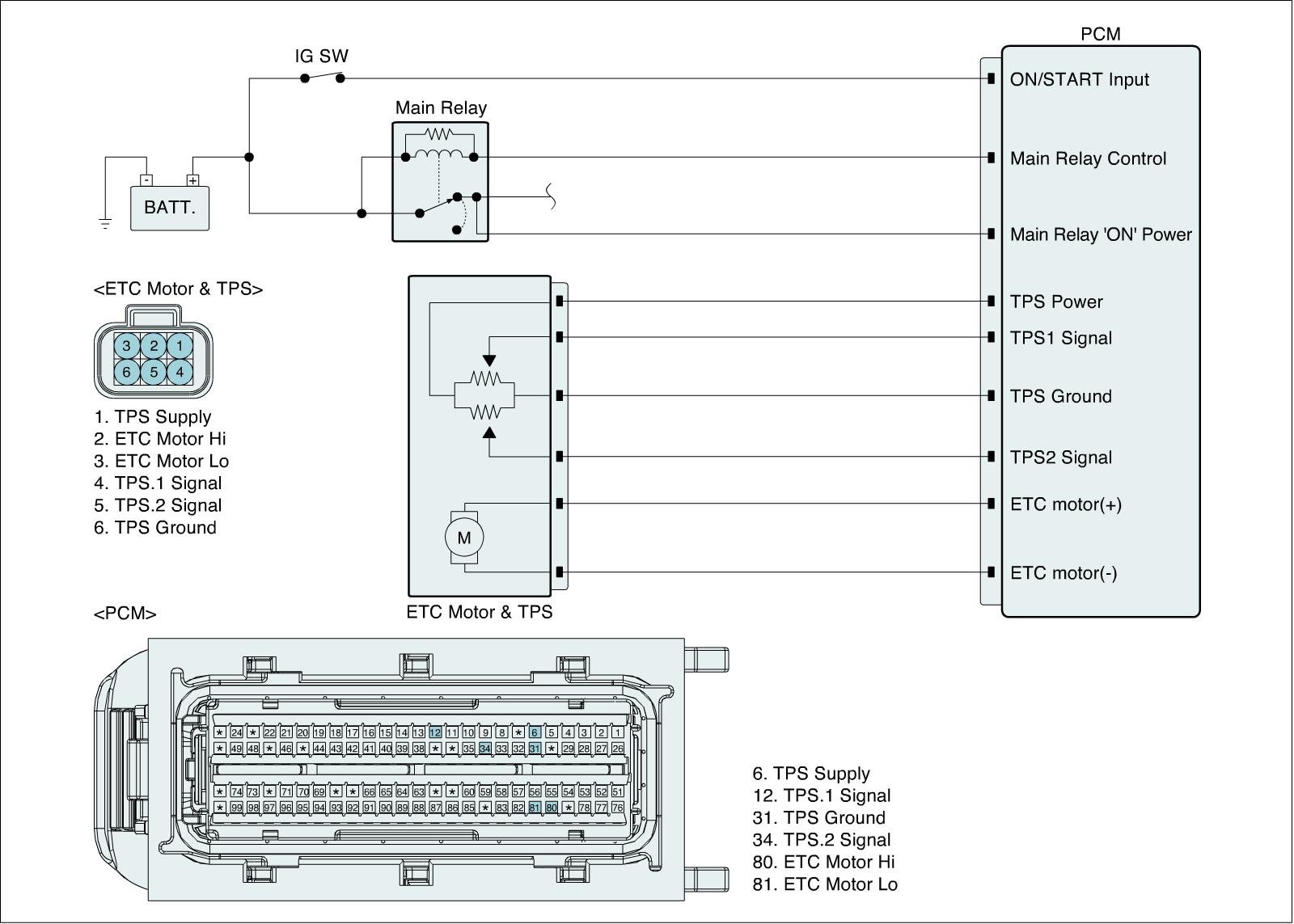 The Electronic Throttle Control (ETC) system is made of the components throttle body, Throttle Position Sensor (TPS) 1 & 2 and Accelerator Position Sensor (APS) 1 & 2. TPS 1 & 2 are sharing the same source voltage and ground. The throttle valve opening is control by throttle motor which is controlled by Engine Control Module (ECM). The opposite position indicator shows inverted signal characteristics. TPS 1 output voltage increases smoothly in proportion with the throttle valve opening angle after starting. TPS 2 output voltage decreases in inverse proportion with the throttle valve opening angle after starting. TPS provides feedback to the ECM to control the throttle motor in order to control the throttle valve opening angle properly in response to the driving condition.
