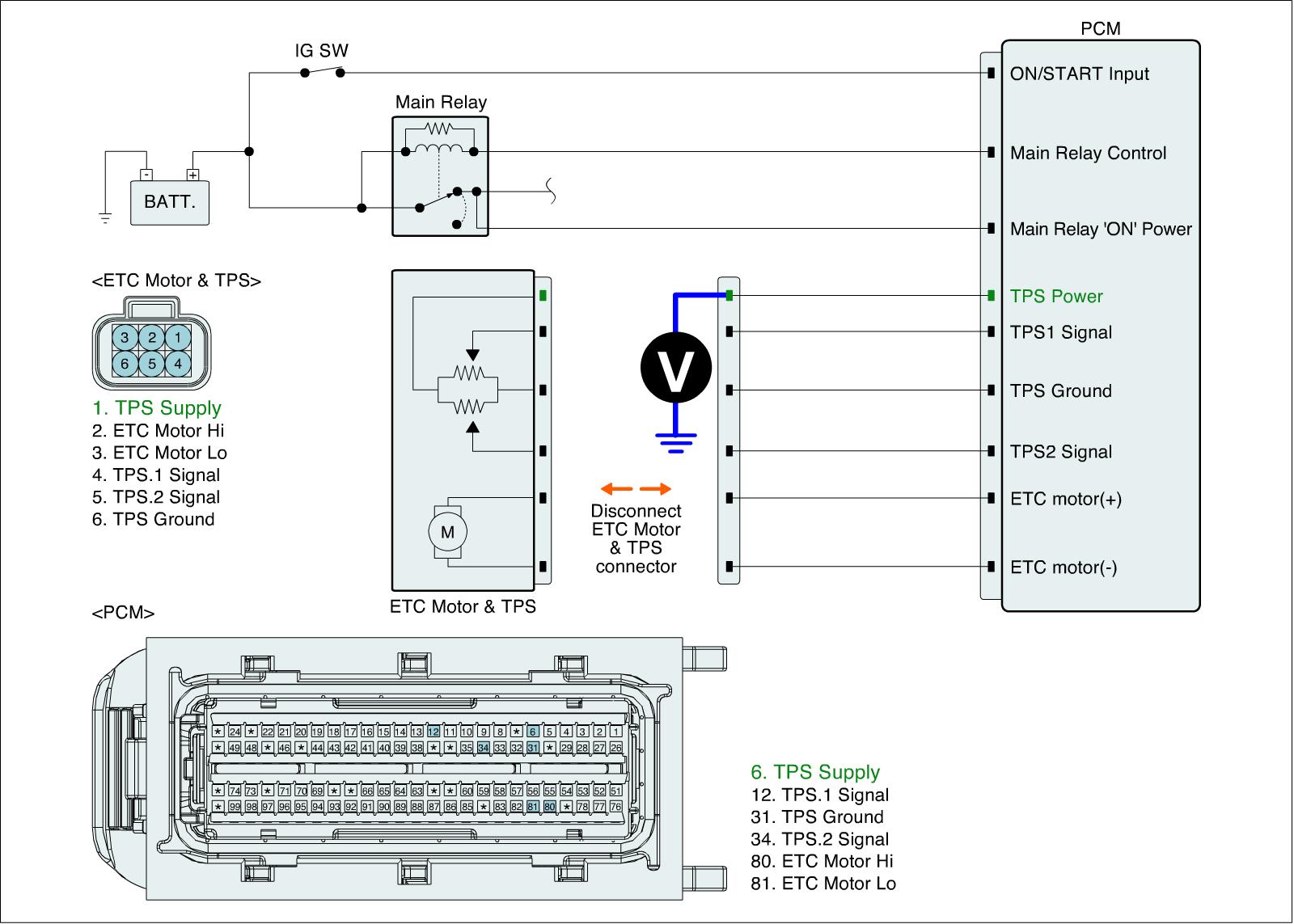 3. Measure voltage between TPS power terminal of ETC Motor & TPS harness connector and chassis ground.