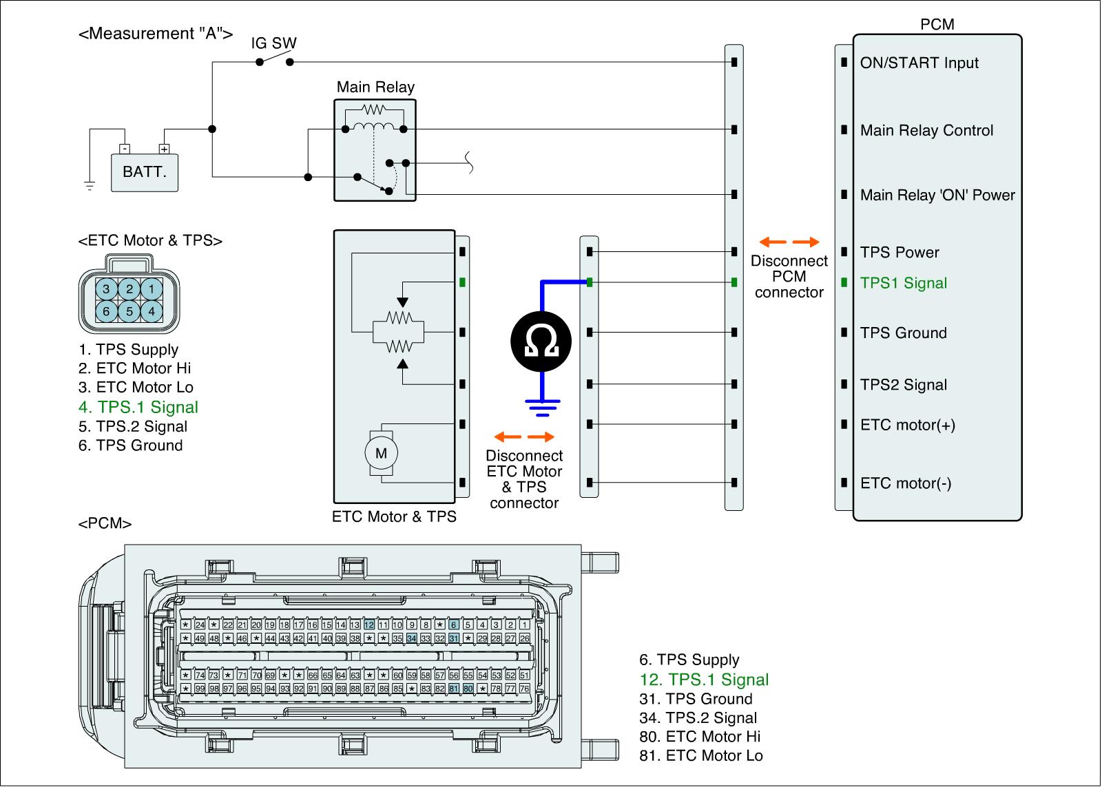 2. Measure resistance between TPS 1 signal terminal of ETC Motor & TPS harness connector and chassis ground. (Measurement "A")