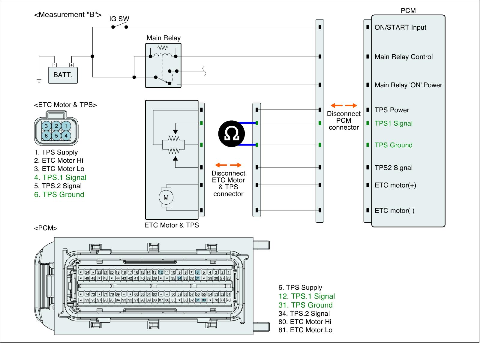 3. Measure resistance between TPS 1 signal and TPS ground terminals of ETC Motor & TPS harness connector. (Measurement "B")