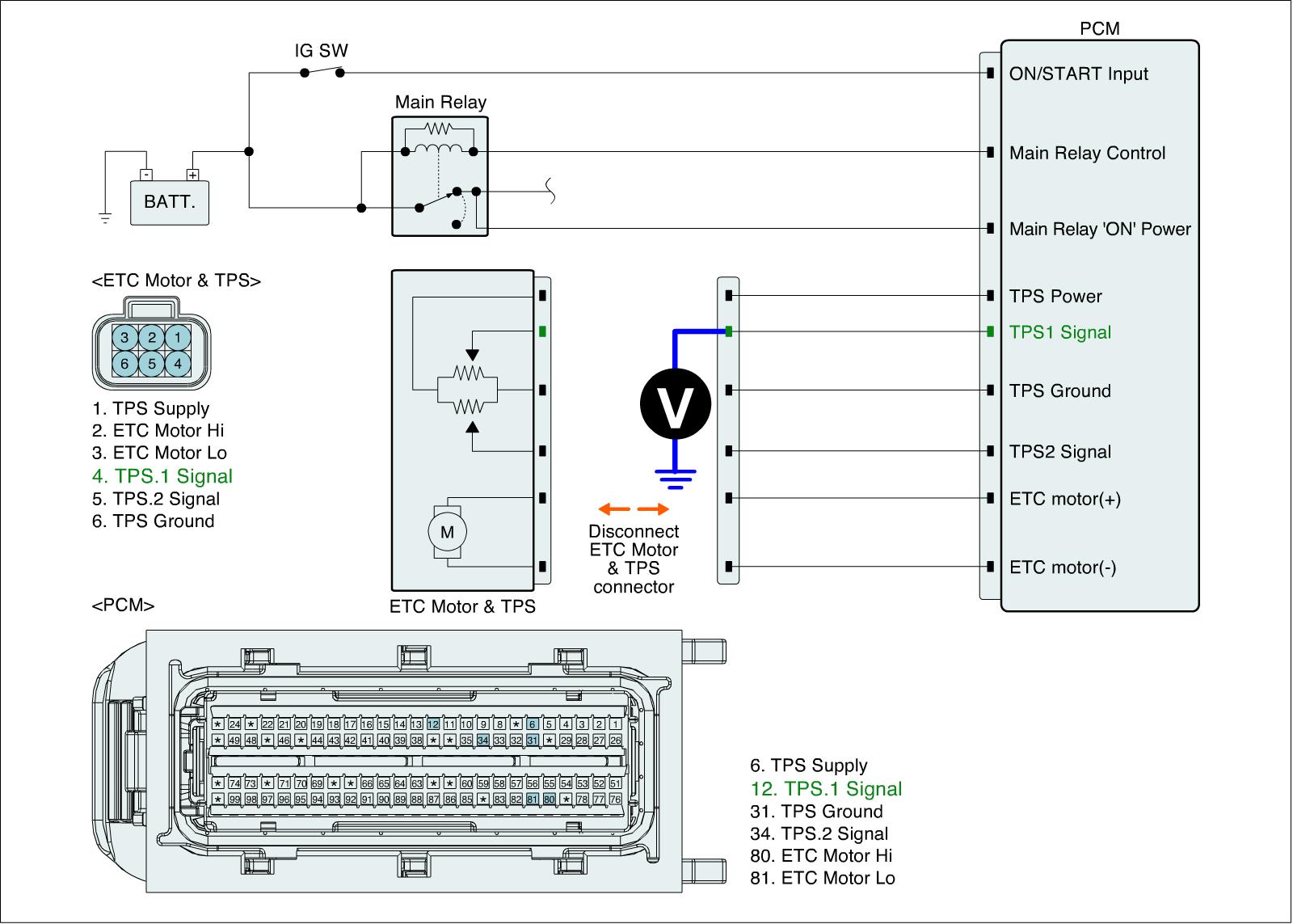 3. Measure voltage between TPS 1 signal terminal of ETC Motor & TPS harness connector and chassis ground.