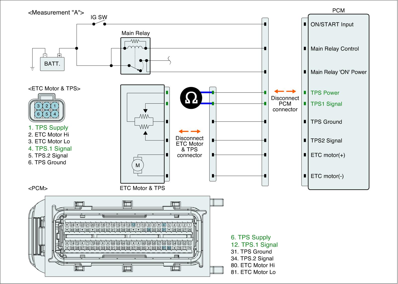 2. Measure resistance between TPS 1 signal and TPS power terminals of ETC Motor & TPS harness connector. (Measurement "A")