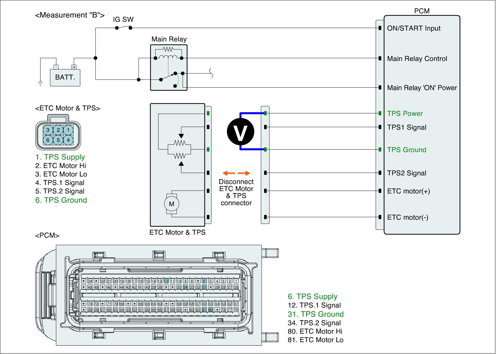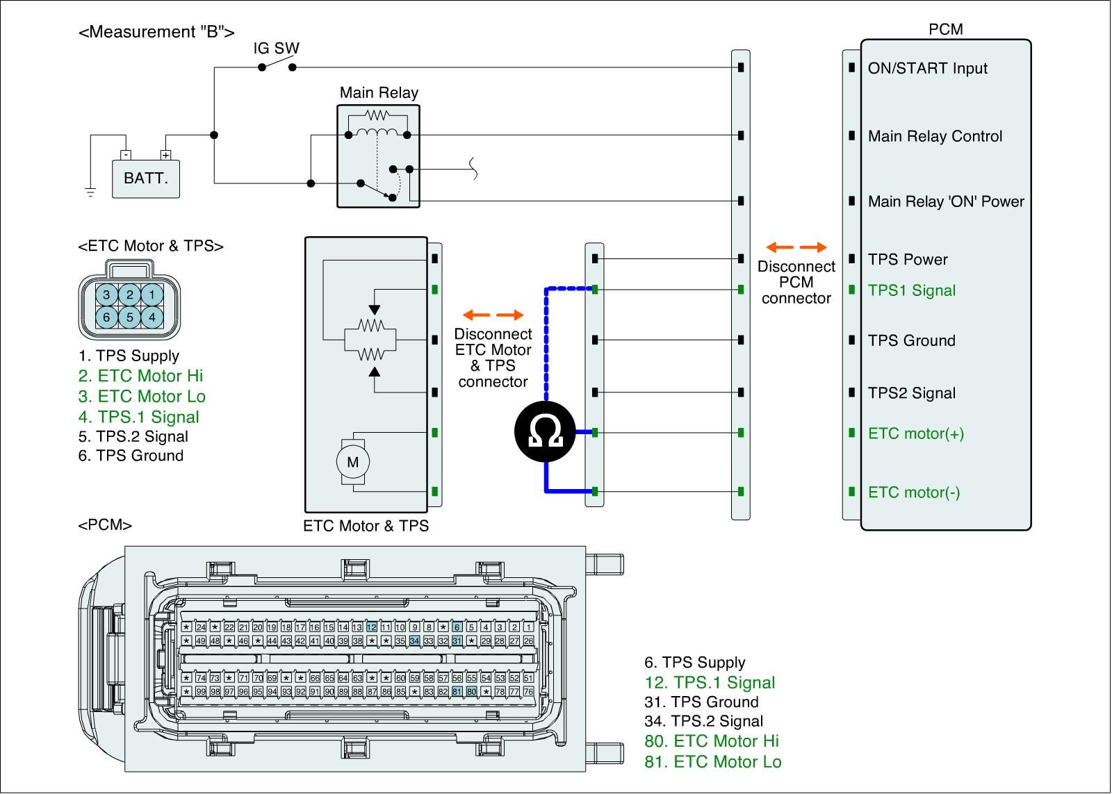 3. Measure resistance between TPS 1 signal and ETC motor (+) terminals of ETC Motor & TPS harness connector. (Measurement "B")