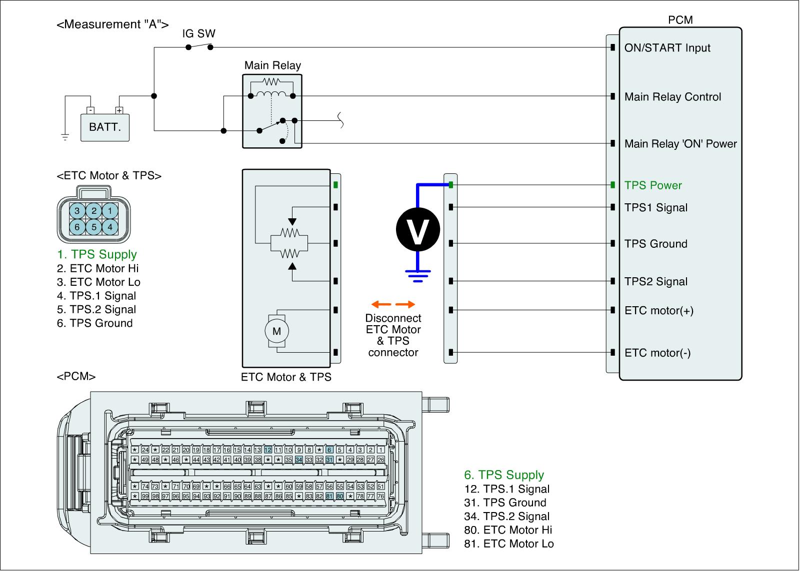 2. Measure voltage between TPS power terminal of ETC Motor & TPS harness connector and chassis ground. (Measurement "A")