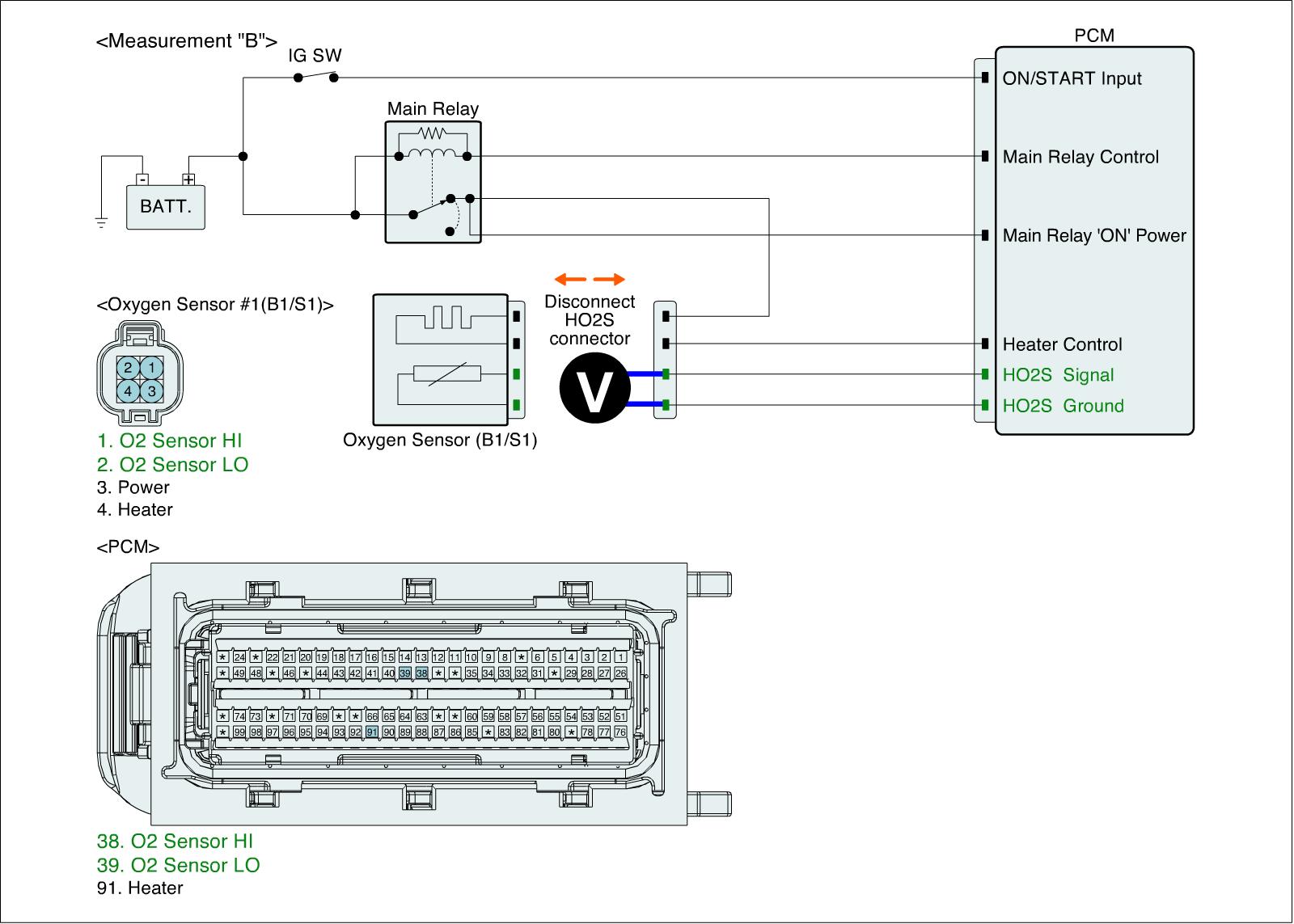 3. Measure voltage between signal and ground terminals of HO2S (B1/S1) harness connector. (Measurement "B")