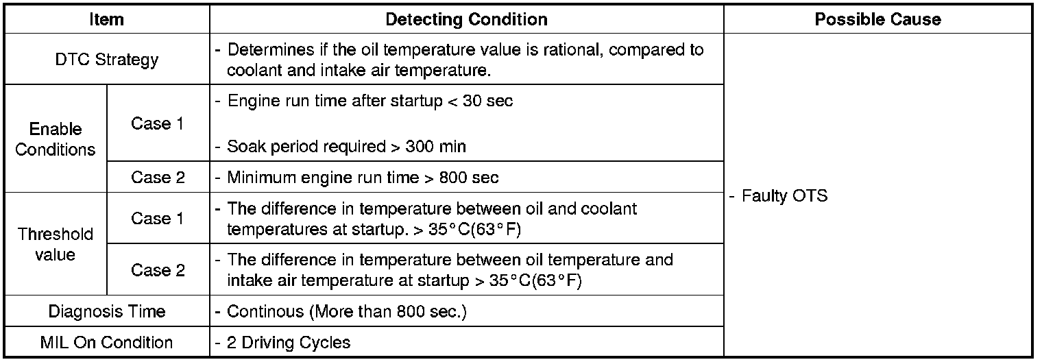 Checking the oil temperature, coolant temperature and intake air temperature every 25 sec. under detecting condition, if the difference in temperature at start-up exceeds threshold value, ECM sets P0196.