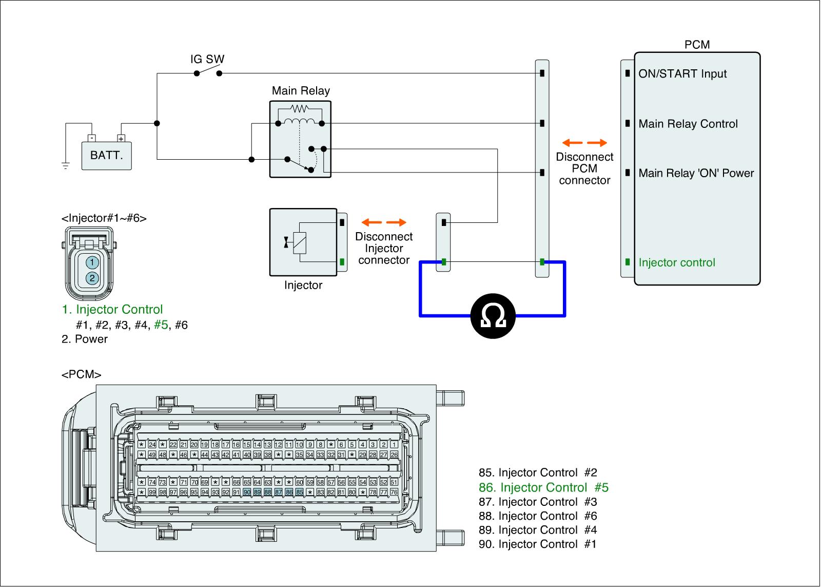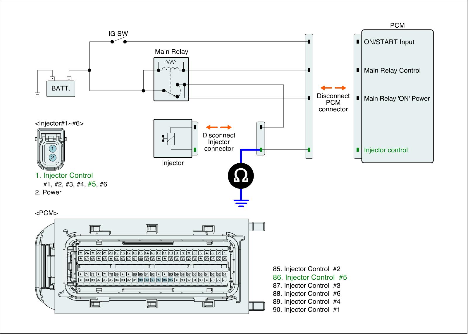 1. IG "OFF" and disconnect injector connector and ECM connector.