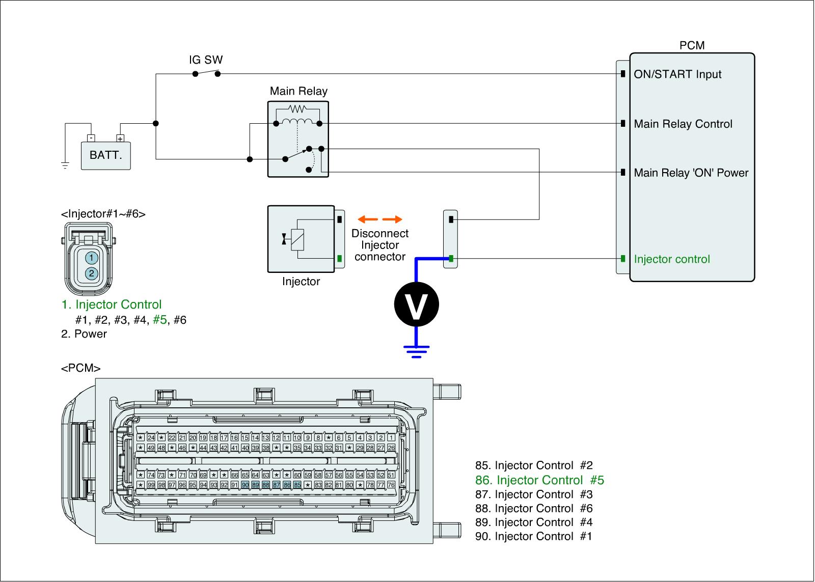 1. IG "OFF" and disconnect injector connector and ECM connector.