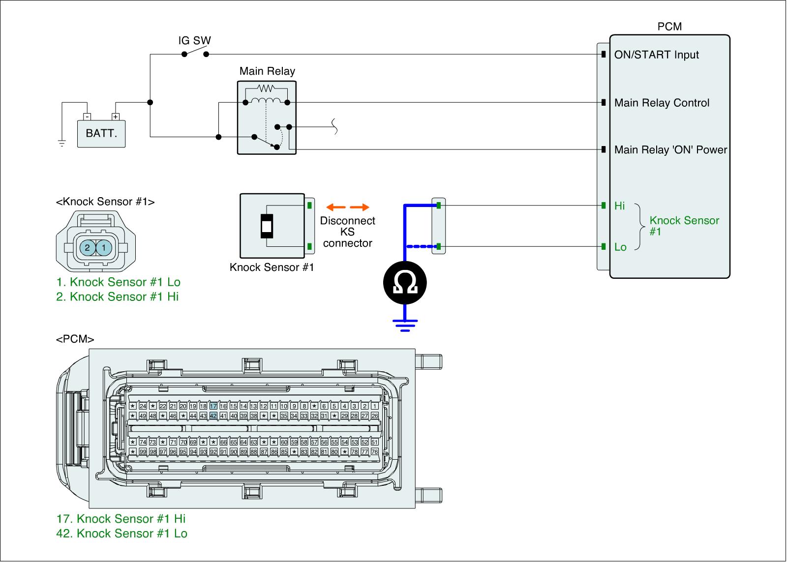 1. IG "OFF" and disconnect knock sensor connector and ECM connector.