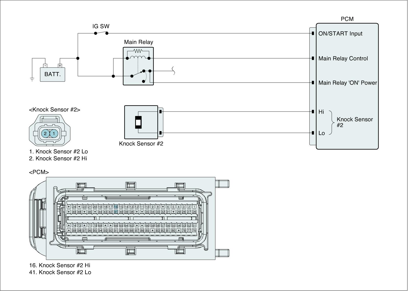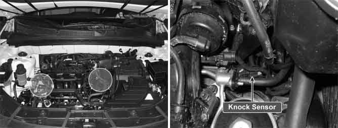 The knock sensor is attached to the cylinder block and senses engine knocking. The sensor contains a piezoelectric element that converts vibration (or noise) into voltage signal and sends this signal to ECM. With input signals from camshaft position and crankshaft position sensor, ECM can identify which cylinder is knocking. ECM filters vibrations and determines if the vibrations are knocking signal. The Engine Control Module (ECM) uses this signal to suppress knocking by retarding ignition timing. The ECM will set a code (Malfunction Indicator Lamp will Not turn on) if during two driving cycles the Knock sensor's output voltage falls below minimum threshold. This code indicates an unexpected vibration is being read by the Knock sensor or ECM under normal engine operation.