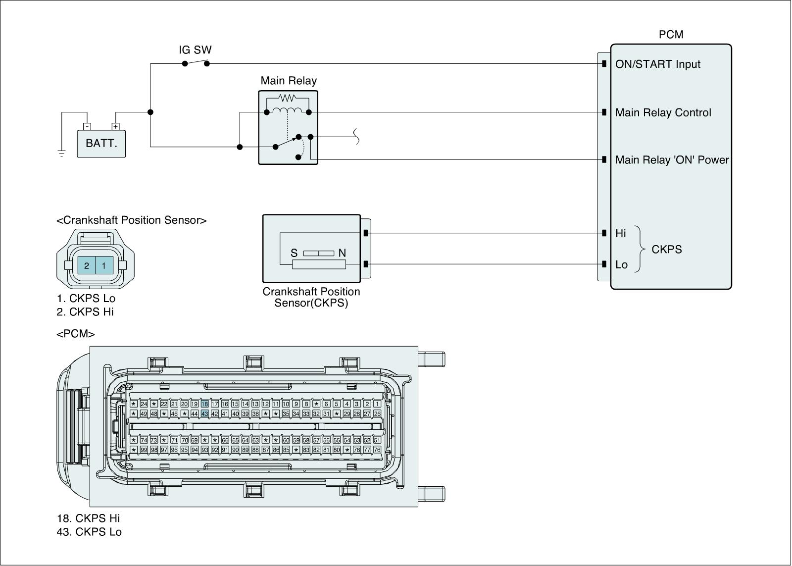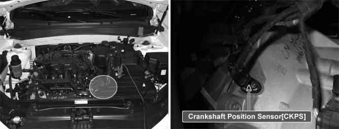 The Crankshaft Position Sensor (CKPS) is a magnetic field sensitive type sensor that generates voltage using a sensor and a target wheel mounted on the crankshaft; there are 58 slots in the target wheel where one is longer than the others. During one crankshaft rotation there are 58 rectangular signals and one longer signal. The ECM calculates engine RPM by using the sensor's signal and controls the injection duration and the ignition timing. Using the signal differences caused by the longer slot, the ECM identifies which cylinder is at top dead center.