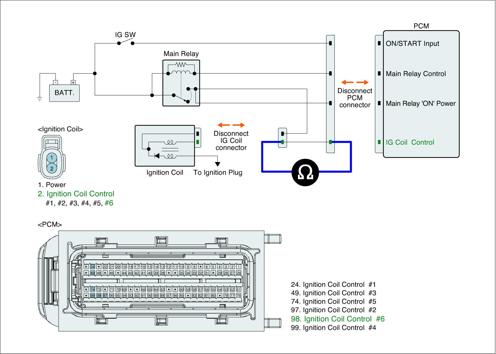 1. IG "OFF" and disconnect Ignition Coil connector and ECM connector.