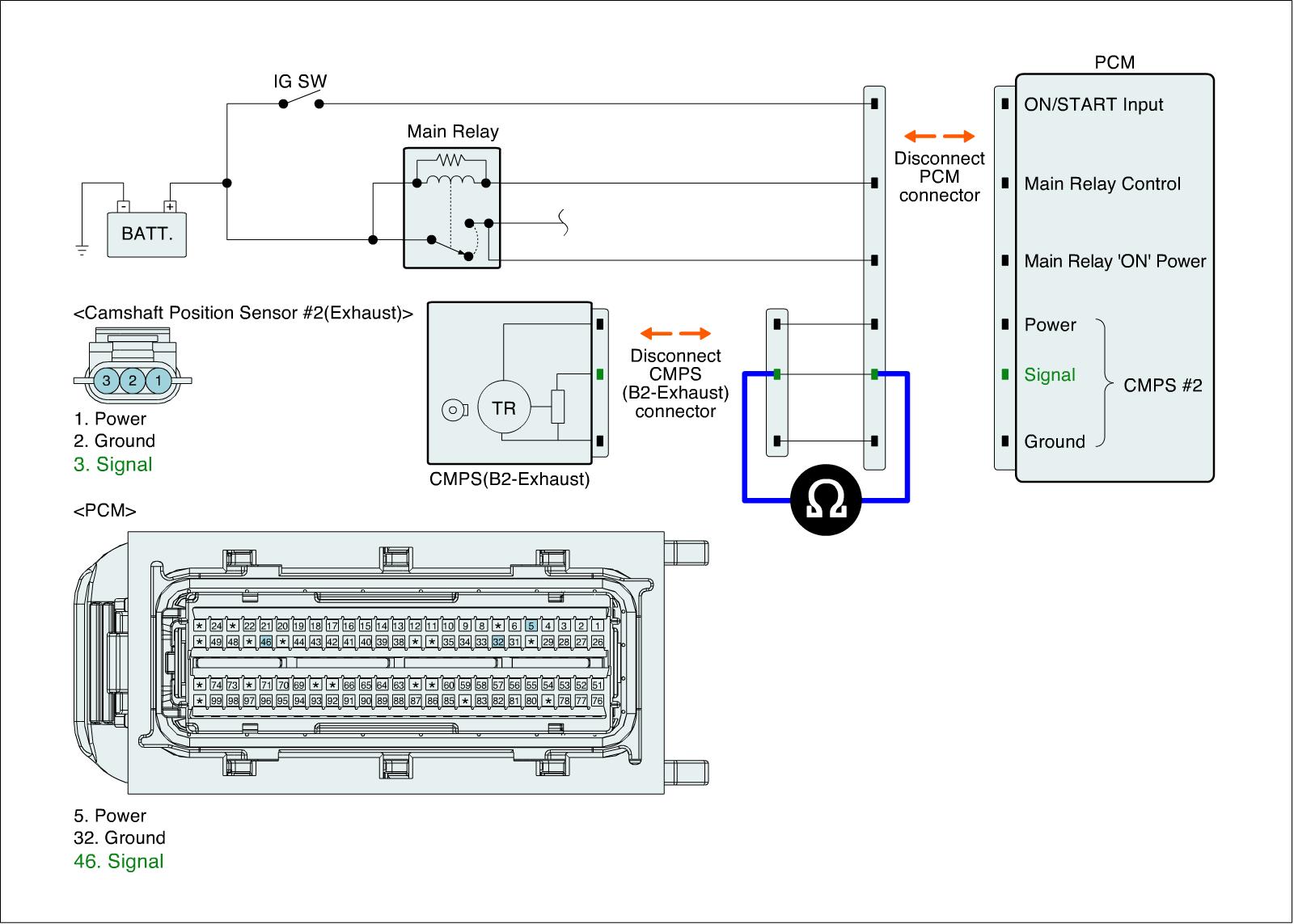 2. Measure resistance between signal terminal of CMPS (B2-Exhaust) harness connector and CMPS (B2-Exhaust) signal terminal of ECM harness connector.
