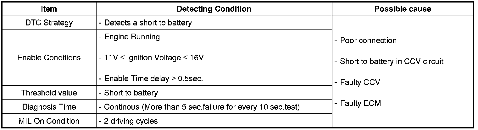 Checking output signals from CCV every 10 sec. under detecting condition, if signals indicating short to battery in the circuit are detected for more than 5 sec, ECM sets P0448. MIL (Malfunction Indication Lamp) turns on when the malfunction lasts till consecutive 2 driving cycle.