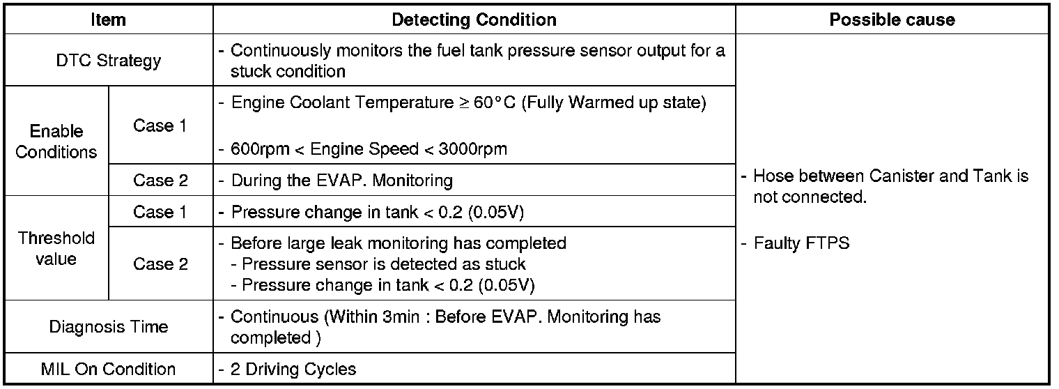 Checking output signals of tank pressure under detecting condition, if the tank pressure does not change less than 0.2 (0.05 V) within 3 min, ECM sets P0451. MIL (Malfunction Indication Lamp) turns on when the malfunction lasts till consecutive 2 driving cycle.
