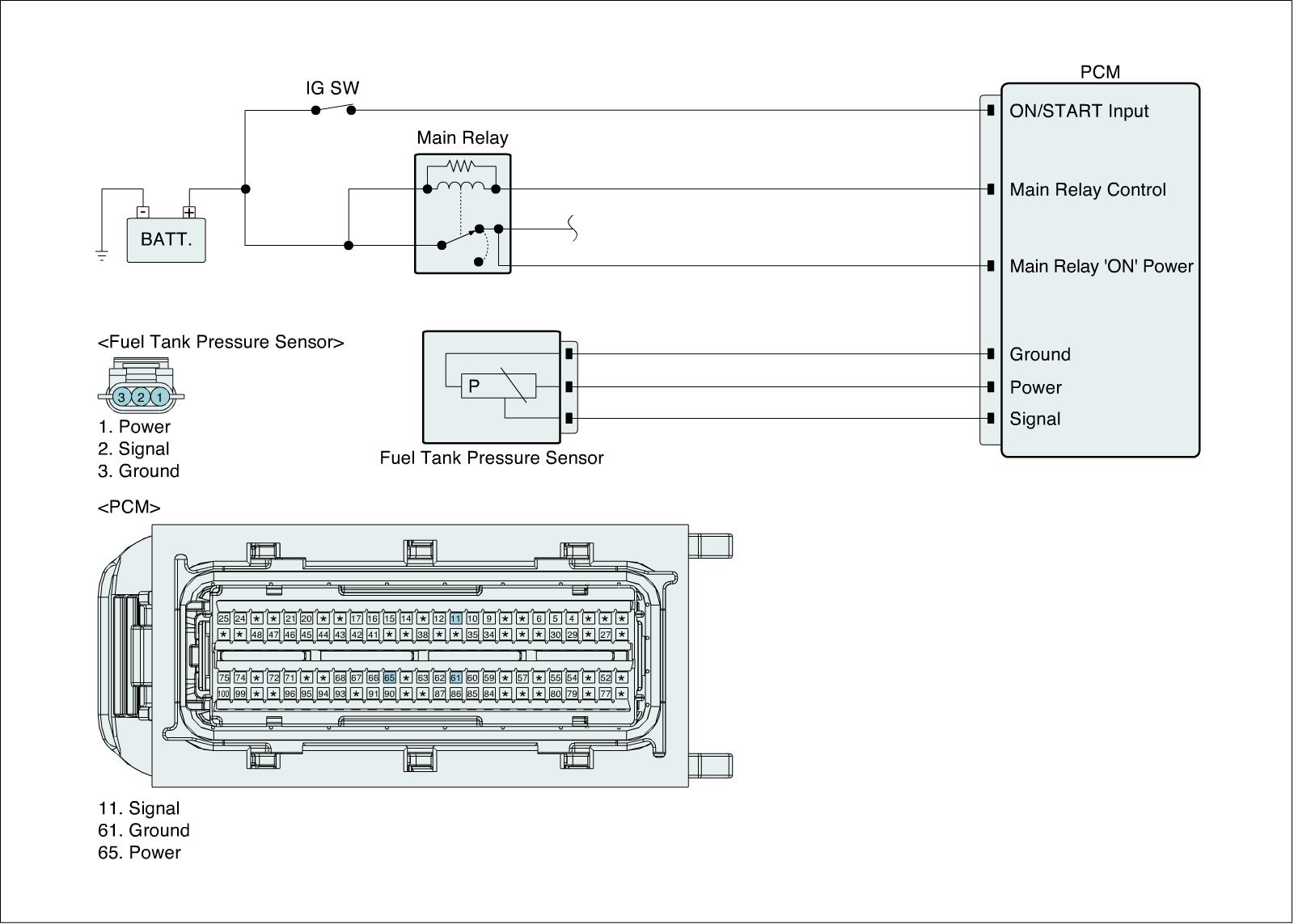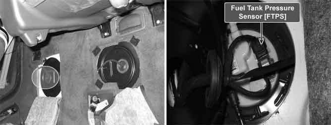 The evaporative emission control system prevents hydrocarbon vapors from escaping from the fuel tank into the atmosphere where they could form photochemical smog. Gasoline vapors are collected in the charcoal canister. The Fuel Tank Pressure Sensor (FTPS) is an integral part of the evaporative monitoring system. The ECM monitors the FTPS signal to detect vacuum decay and excess vacuum. The FTPS measures the difference between the air pressure inside the fuel tank and outside air pressure to check the purge control solenoid valve operation and for leak detection in the evaporative emission control system by monitoring pressure and vacuum levels in the fuel tank during the purge control solenoid valve operating cycles.
