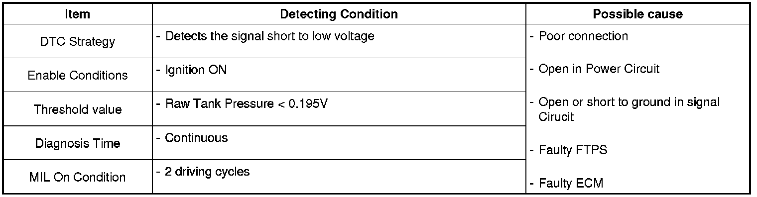 Checking output signals of fuel tank pressure sensor under detecting condition, if the tank pressure is lower than threshold, ECM sets P0452. MIL (Malfunction Indication Lamp) turns on when the malfunction lasts till consecutive 2 driving cycle.