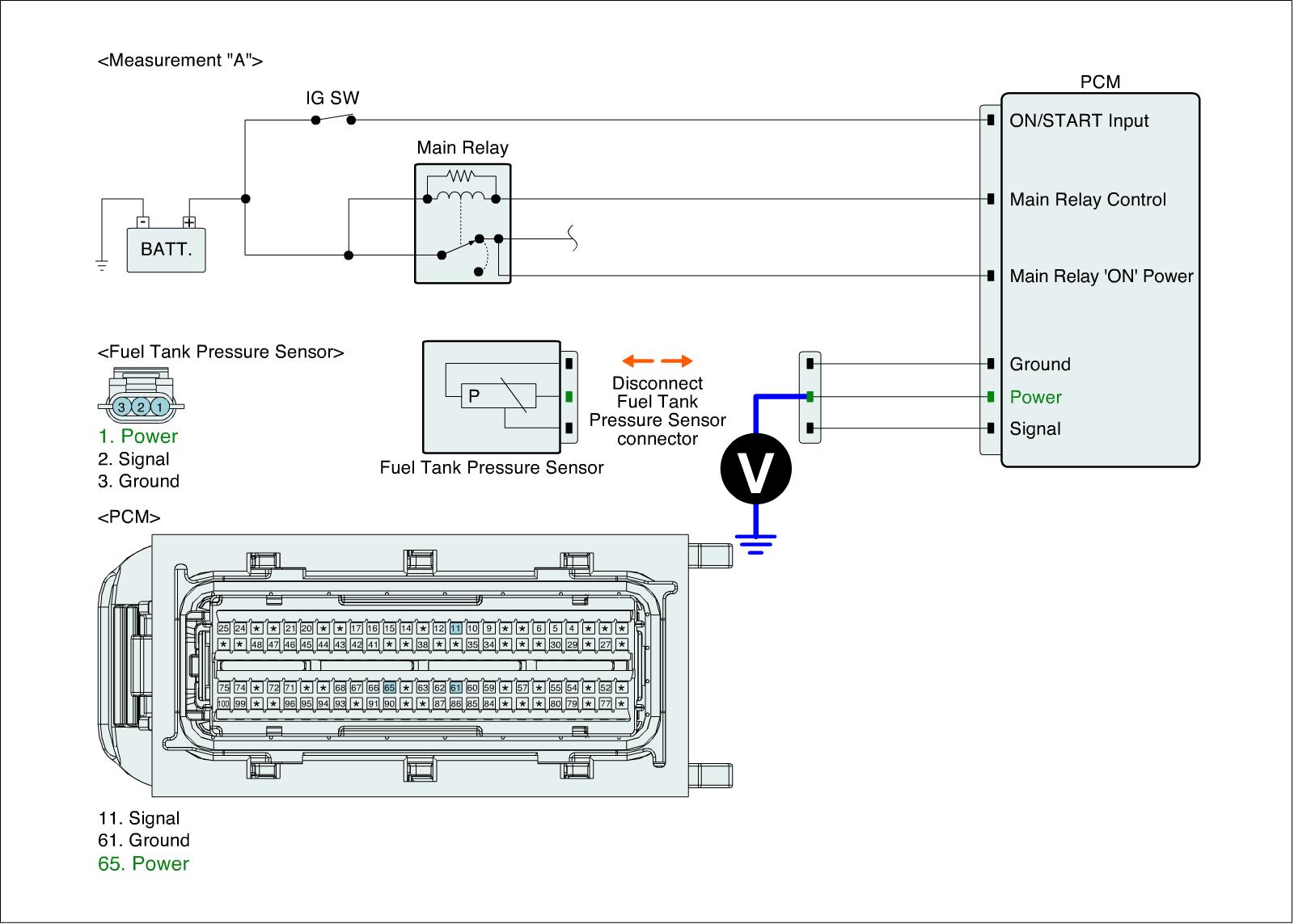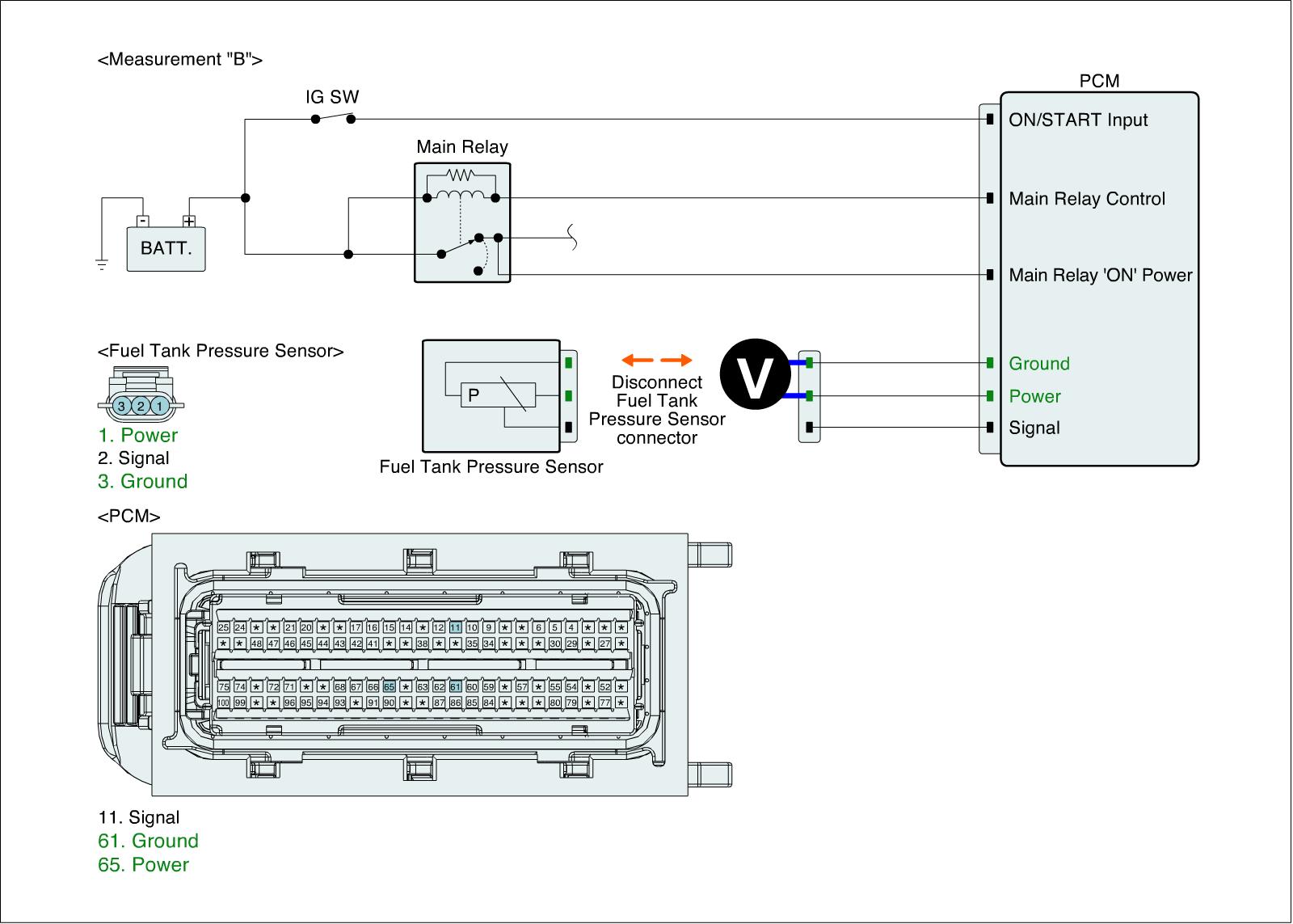 4. Measure the voltage between power and ground terminals of FTPS harness connector. (Measurement "B")