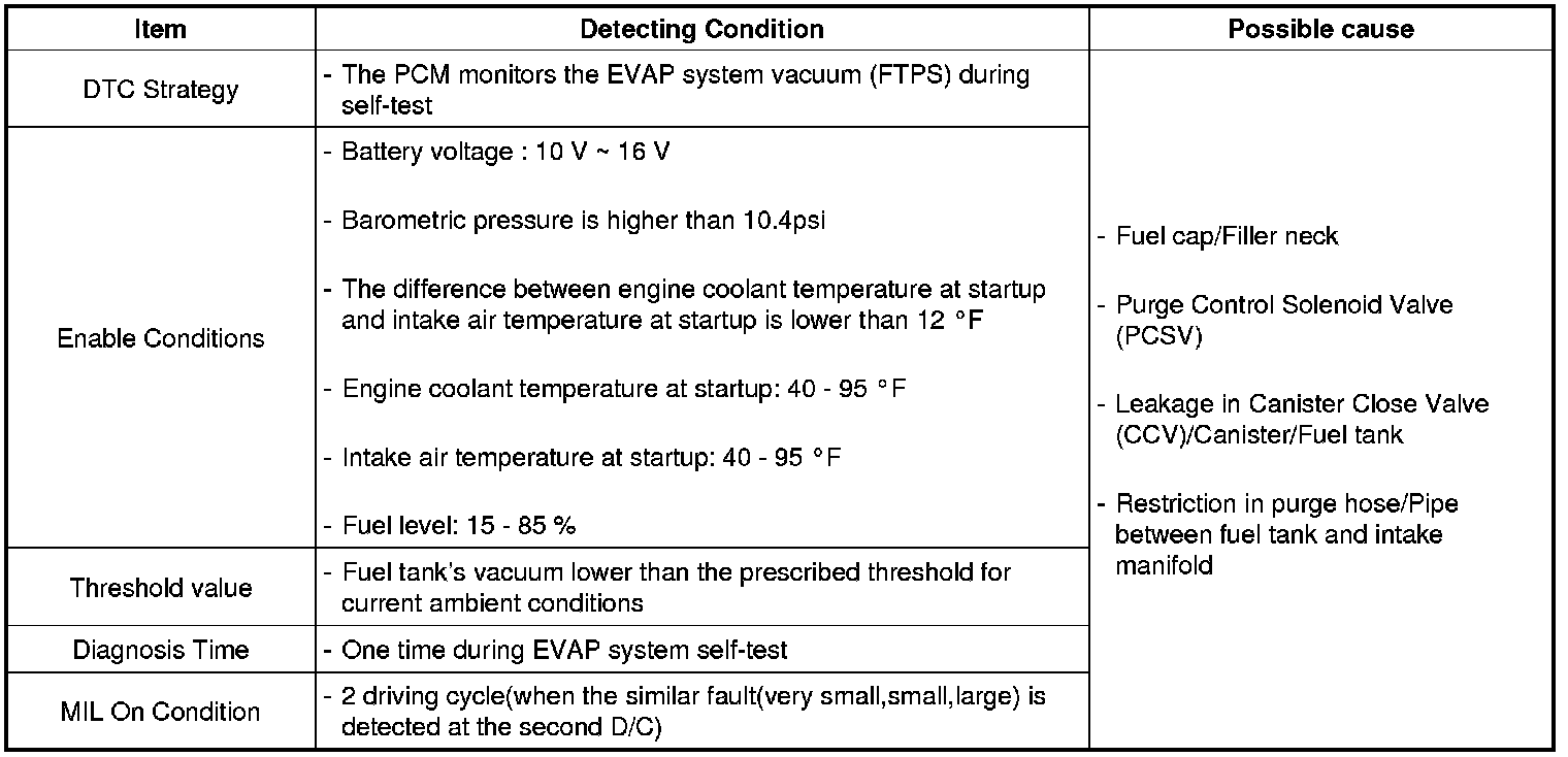 The Powertrain Control Module (PCM) monitors the output signal from the Fuel Tank Pressure Sensor (FTPS) during the Evaporative Emission Control System (EVAP) vacuum self-test. If the vacuum in the tank does not drop to the prescribed threshold, the PCM sets P0455 and turns on the Malfunction Indication Lamp (MIL).