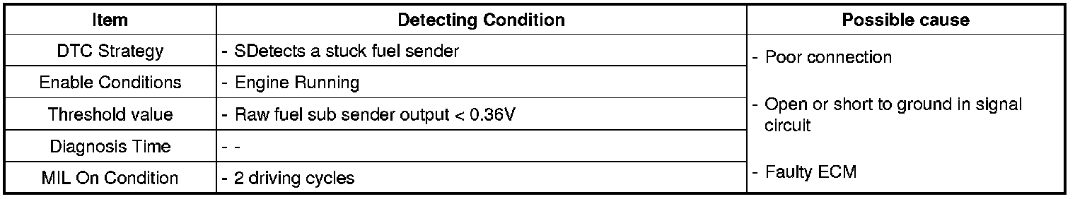 Checking output signals of fuel sub sender under detecting condition, if the fuel level voltage is low than 0.36 V, ECM sets P0462. MIL (Malfunction Indication Lamp) turns on when the malfunction lasts till consecutive 2 driving cycle.