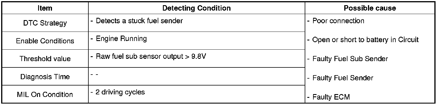 The Fuel Level Sensor (FLS) measures the fuel level in fuel tank and its information is used to supply the ECM with information regarding the monitoring condition of the EVAP canister purge system for leak detection. If the fuel level sensor is monitored for high or low stuck or difference between voltage of fuel level sensor and voltage deviation of fuel level sensor is exceeds limited value while driving, this is interpreted by the ECM as a fault