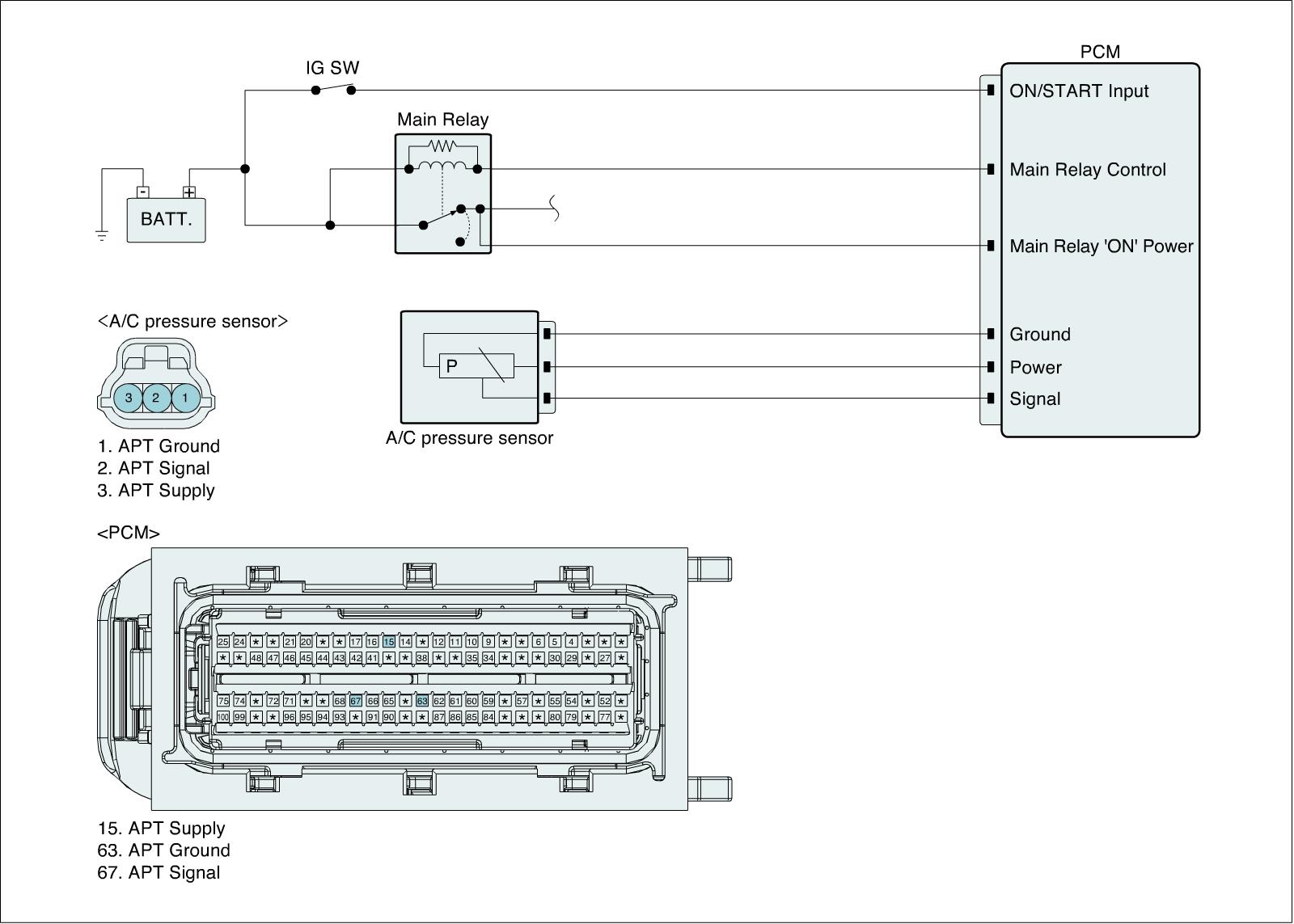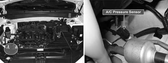 he ECM (Engine Control Module) receives pressure signal in the A/C refrigerant high pressure side from the A/C refrigerant pressure sensor. This input indicates how much load the A/C compressor is putting on the engine and is one of the factors used by the ECM in order to determine the idle air control position for the idle speed. The circuits consist of a 5 V reference and a ground, both provided by the ECM, and a signal from the sensor. The signal is a voltage which is proportional to the A/C pressure from 0 to 5 V. Low pressure produces a low voltage signal and high pressure a high-voltage signal.